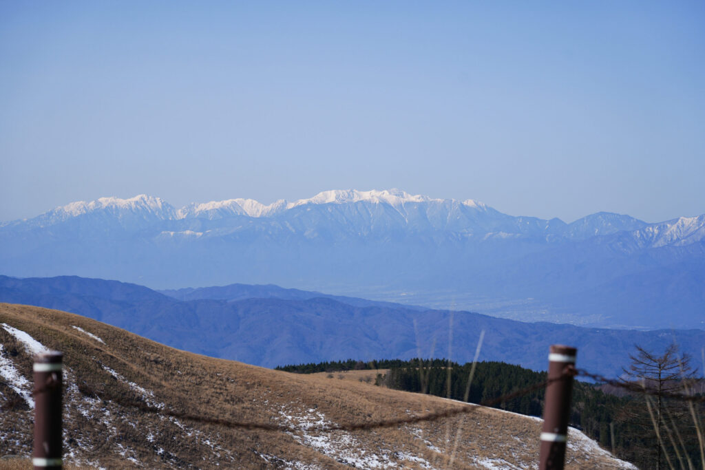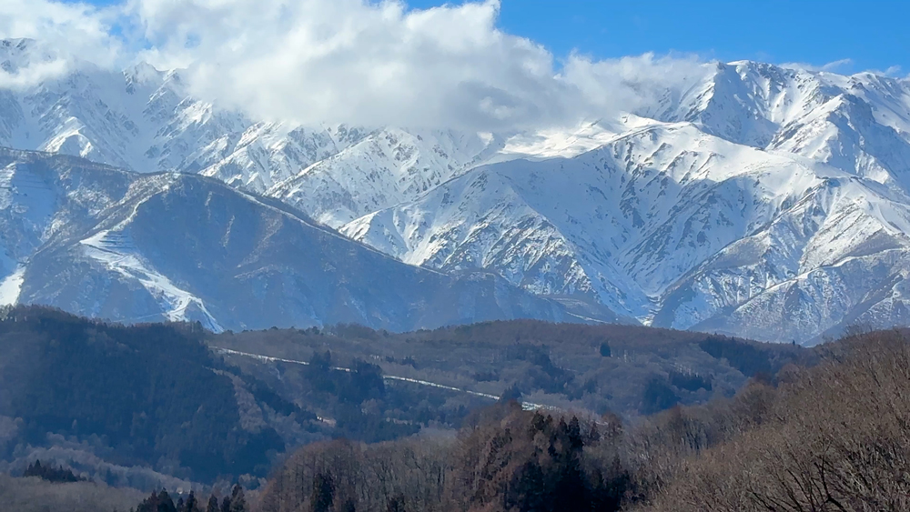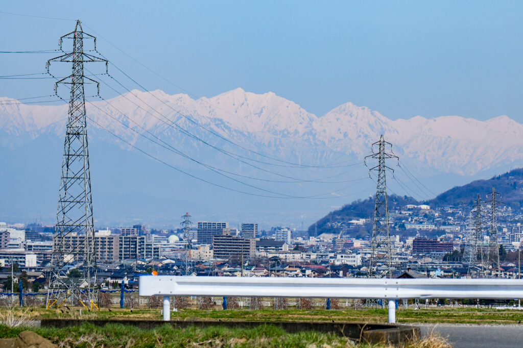 遠くに北アルプスの雪山が見えてきます