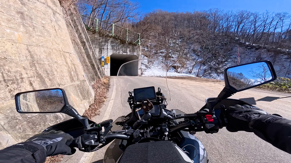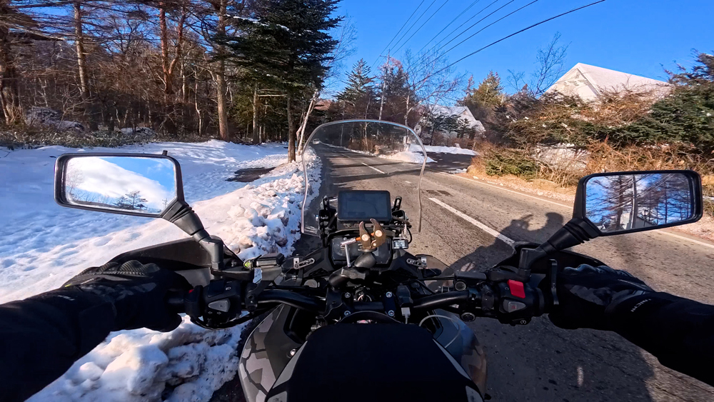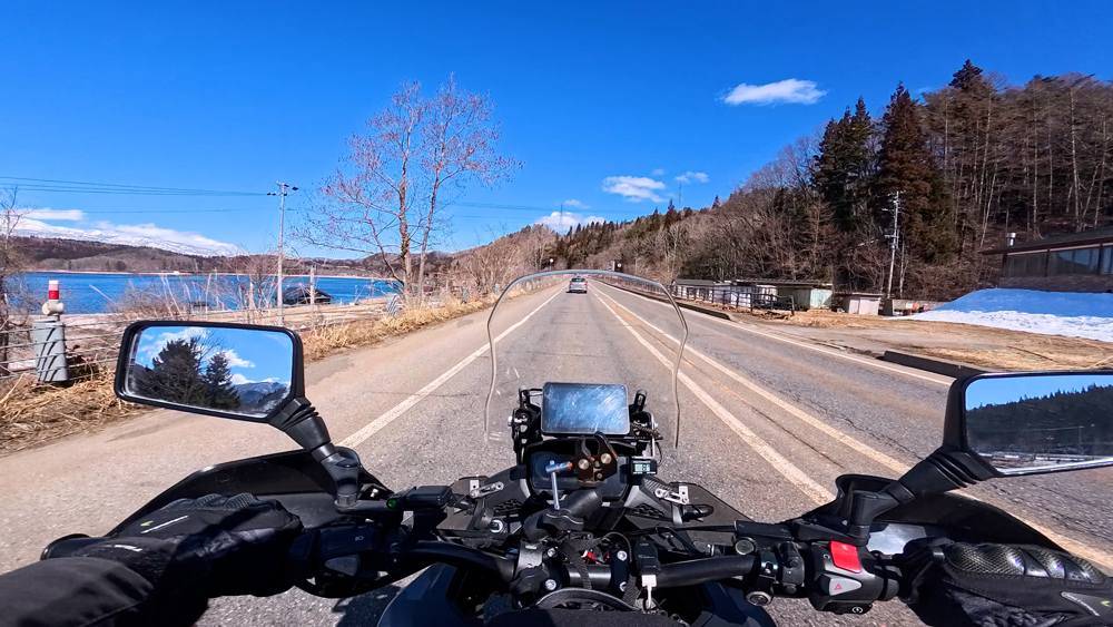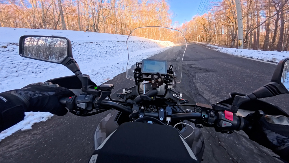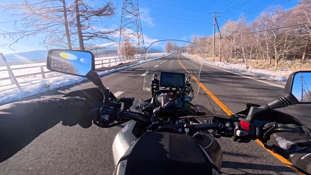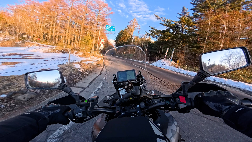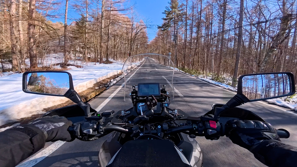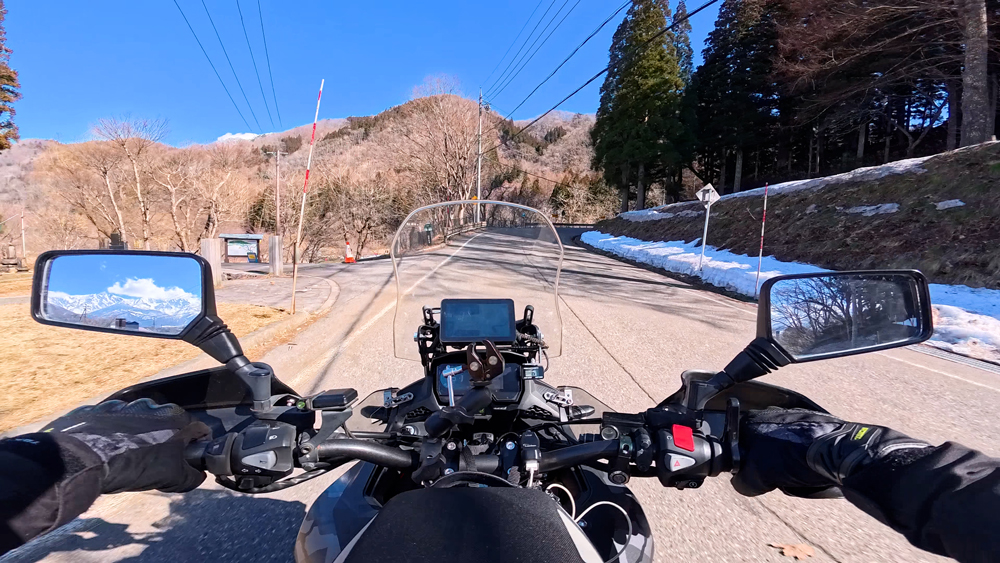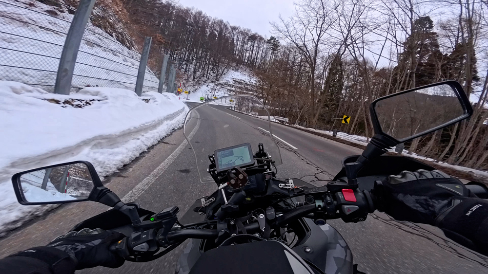 路肩の積雪や凍結箇所もあり、早春ツーリングらしいコンディションです。