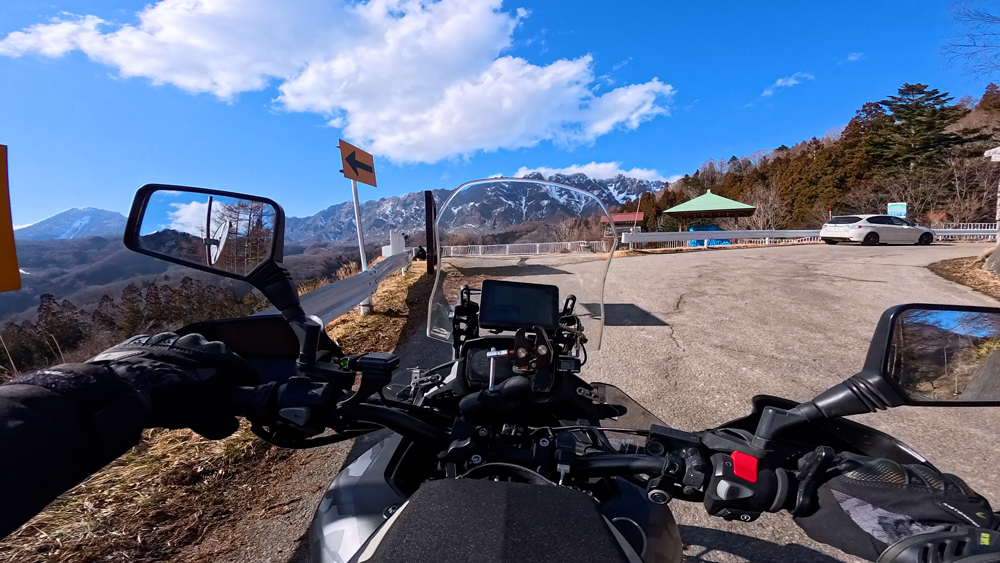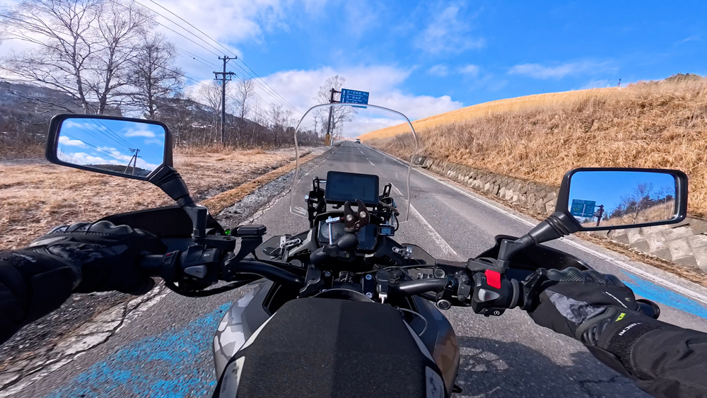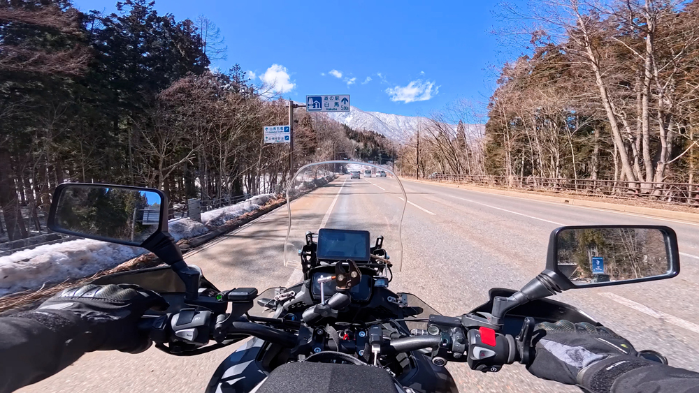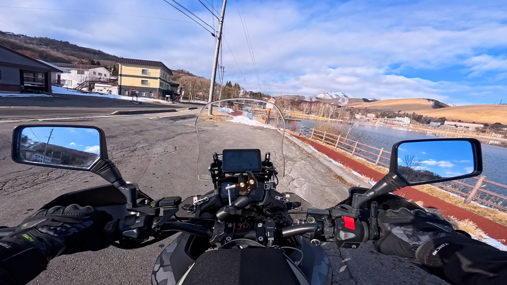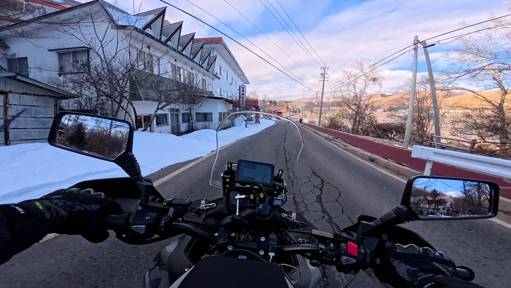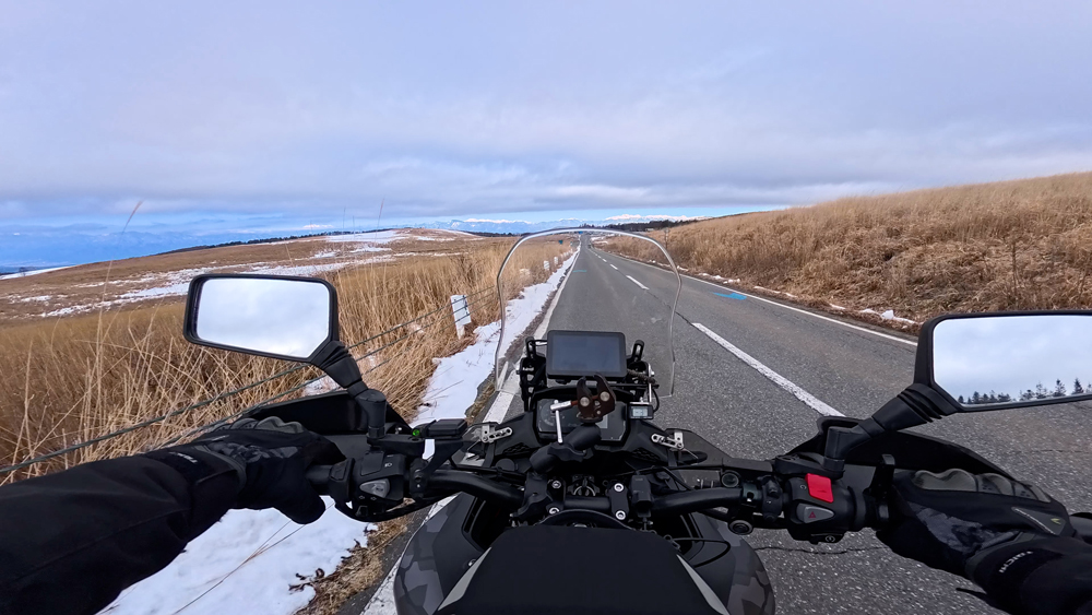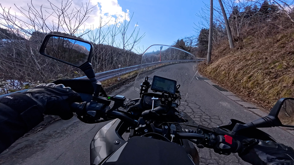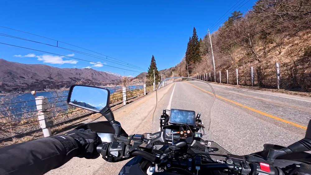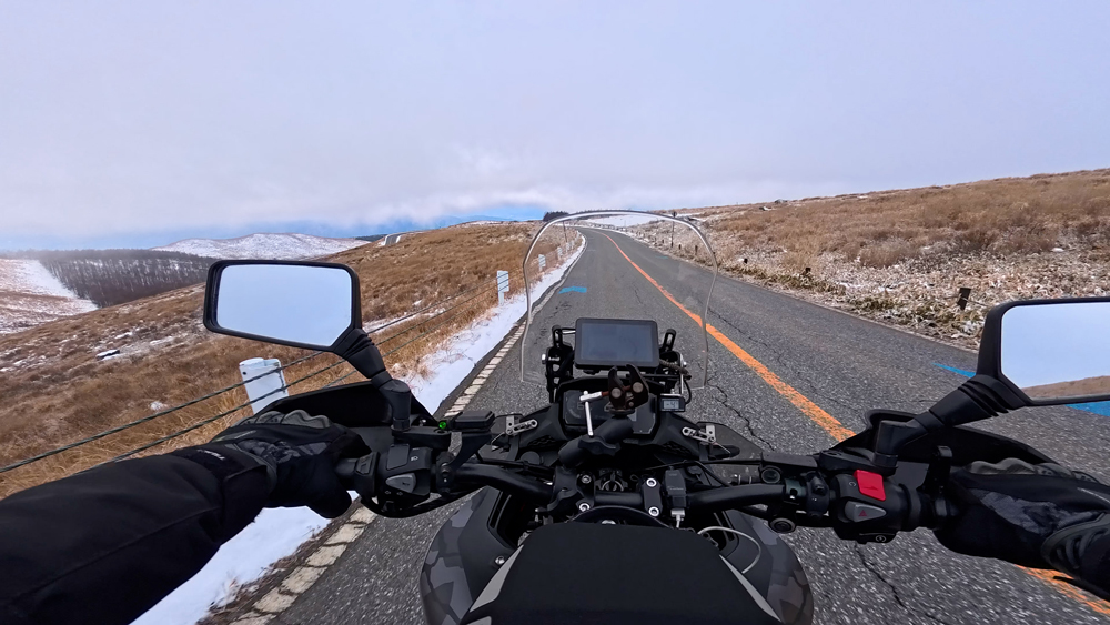 路肩の積雪や凍結箇所もあり、早春ツーリングらしいコンディションです。